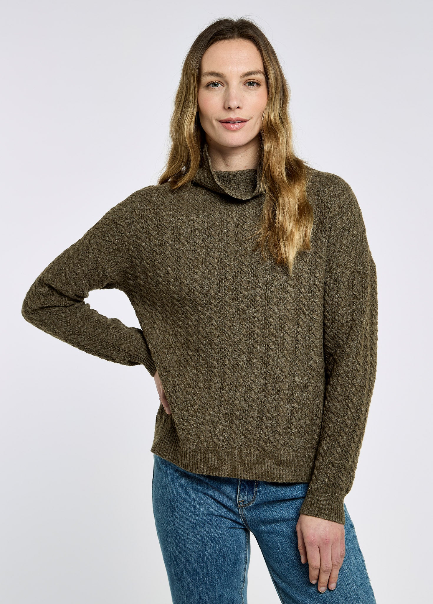- Cosy funnel neck falls into a flattering shape on the body