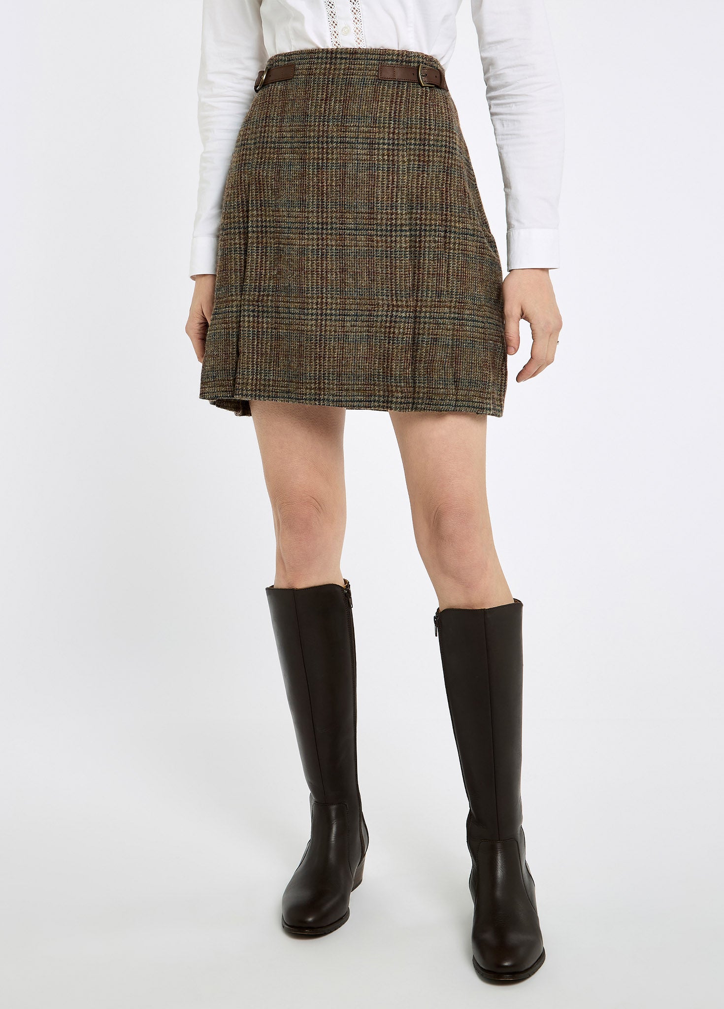 Made in a bespoke Dubarry tweed, this soft tweed skirt is fully lined and has beautifully stitched-down pleated panels. Dress up or down with knitwear or cotton shirting allowing the neat side buckles in real leather to add a touch of finesse.